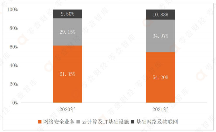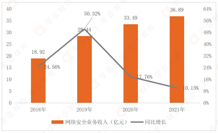 2021年,深信服的網絡安全業務收入為36.89億元,營收占比為54.20%,仍是深信服的核心收入來源。但從營收增速看,網絡安全業務增速明顯放緩,已經從2019年的50.32%下降至2021年的10.15%。