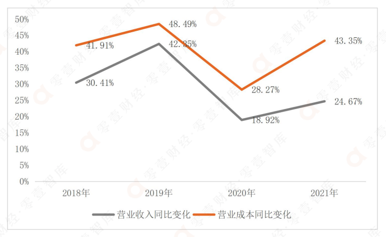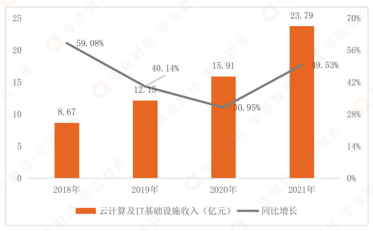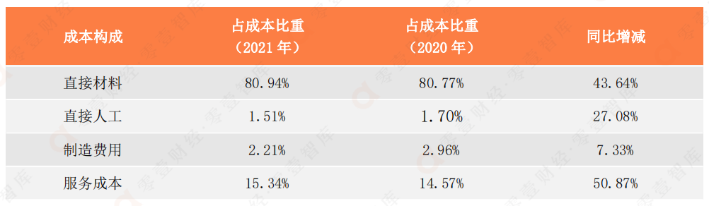 具體來看,2021年,直接材料費用占營業成本的比重最大,接近81%,金額約19億元,同比增長43.64%。其中,云計算及IT服務基礎設施直接材料費用約11億元,占營業成本比重為49.5%。