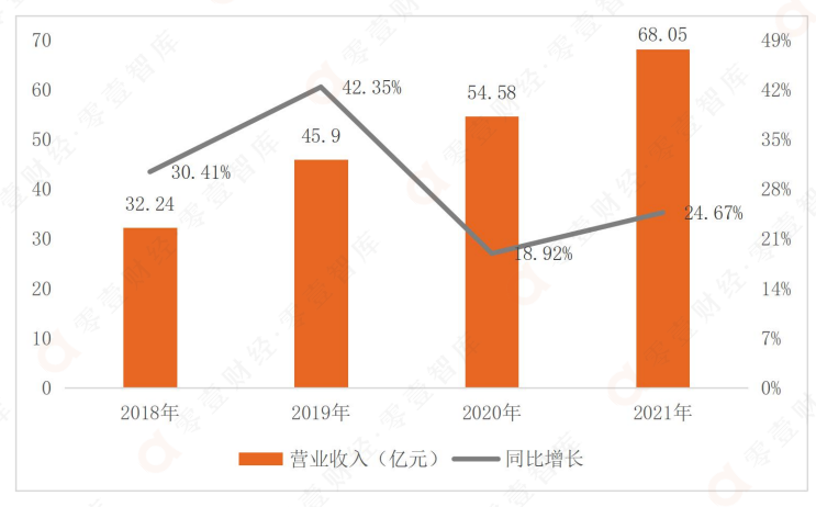 2021年,深信服的營業收入為68.05億元,增速為24.67%。總體來看,自2018年上市以來,深信服的營收規模一直保持增長態勢,年平均增速為28.28%。2022年一季度,深信服的營業收入為11.44億元,同比增長4.76%,2021年同期增速為79.31%。