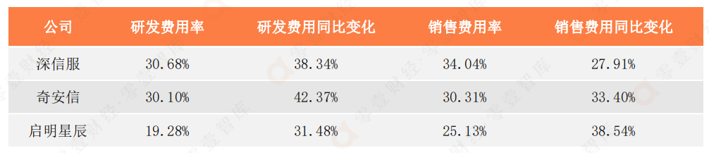 此外,從2021年全年看,深信服的研發費用率和銷售費用率均高于同行業的奇安信-U(688561.SH)、啟明星辰(002439.SZ),而深信服的營收規模卻高于奇安信(58.09億元)、啟明星辰(43.86億元)。由此可見,深信服在研發和銷售方面的投入相對較高。