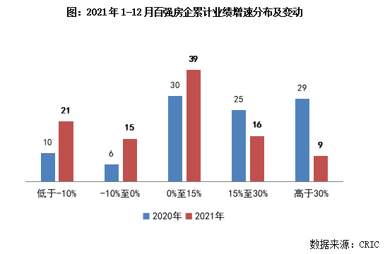 2021年,百強房企整體表現不及去年同期,年內累計業績同比降低的企業數量增加。具體來看,截至12月末近4成百強房企累計業績同比降低,銷售規模負增長的企業數量較2020年有明顯提升。單月業績來看,12月逾8成百強房企單月業績同比降低,其中逾6成房企同比降幅大于30%,20家房企單月業績同環比雙降。