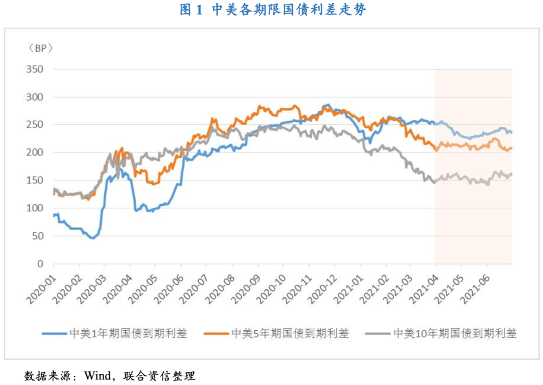 從中國貨幣政策看,隨著疫苗接種的持續(xù)推進,國內(nèi)經(jīng)濟保持穩(wěn)定恢復(fù),內(nèi)生動力加強,央行貨幣政策保持松緊適度,并綜合運用多種貨幣政策工具,通過公開市場操作、中期借貸便利(MLF)、定向中期借貸便利(TMLF)、常備借貸便利(SLF)以及央行票據(jù)互換等工具維持市場流動性的合理充裕。在此背景下,中國國債收益率在2021年二季度總體呈下行態(tài)勢,且下行幅度超過美債收益率下行幅度。