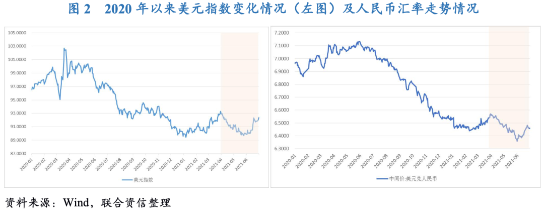 從人民幣匯率走勢來看,2021年年初以來,人民幣匯率走勢與美元指數(shù)走勢之間表現(xiàn)出較強的負相關(guān)性(圖2)。4-5月期間,美國通脹持續(xù)攀升、貨幣政策持續(xù)保持寬松、疫情持續(xù)反復(fù)等因素推動美元指數(shù)從93左右跌至90關(guān)口下方;另一方面,中國經(jīng)濟的持續(xù)回暖則給人民幣匯率提供了較強的支撐,人民幣匯率在5月底回到6.40關(guān)口下方,達到近三年以來的新高。