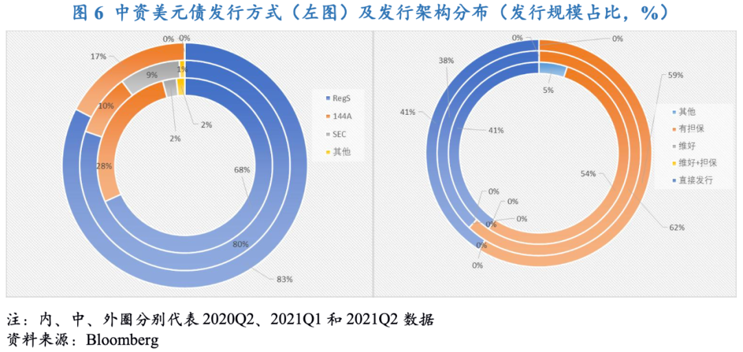 從發(fā)行架構(gòu)看,2021年二季度,擔(dān)保發(fā)行和直接發(fā)行仍是中資美元債最主要的兩種發(fā)行方式。具體來看,擔(dān)保發(fā)行債券合計達到277.8億美元(105期),約占總規(guī)模的58.9%,環(huán)比下降3.1個百分點,同比上漲4.6個百分點;直接發(fā)行債券共48期,發(fā)行金額達到194.0億美元,占總規(guī)模比為41.1%,環(huán)比和同比分別上升3.2個和0.5個百分點;本季度沒有以維好架構(gòu)以及擔(dān)保+維好雙重架構(gòu)增信的中資美元債,表明市場對于維好架構(gòu)的增信作用越來越不認可。