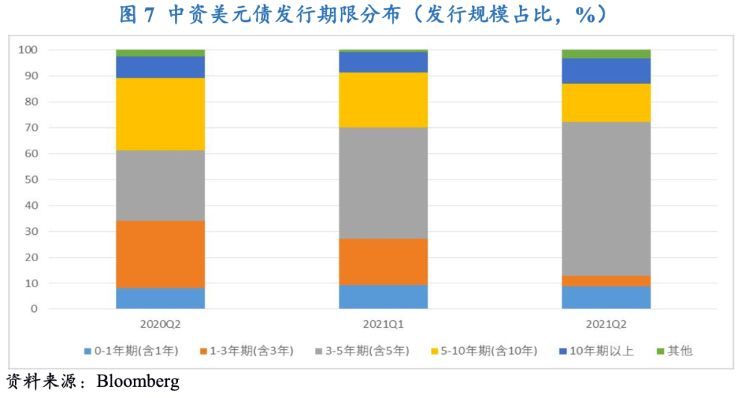 從美國貨幣政策看,盡管今年以來美國通脹持續(xù)走高,但美聯(lián)儲一直堅稱物價上漲是“不可持續(xù)的”,認為疫情沖擊導(dǎo)致的供求失衡是“暫時的”,隨著疫情封鎖進一步放松、供需逐步趨向平衡,通脹終將消退。因此,美聯(lián)儲在6月的議息會議上維持了寬松貨幣政策立場不變,但開始討論縮減購債規(guī)模的時間,向市場提前傳遞部分轉(zhuǎn)向信號。另一方面,2021年二季度以來,美國國內(nèi)疫情仍有反復(fù),盡管疫苗接種正在穩(wěn)步推進,但隨著傳播性更強的Delta變異毒株出現(xiàn),美國疫情防控形勢仍不容樂觀;從經(jīng)濟數(shù)據(jù)表現(xiàn)來看,美國4月和5月非農(nóng)就業(yè)數(shù)據(jù)接連不及預(yù)期,在一定程度上引發(fā)了市場對于美國經(jīng)濟復(fù)蘇前景的擔(dān)憂;自拜登3月底提出2.3萬億美元的基建法案以來,其推進進程一直受到共和黨阻礙,預(yù)算規(guī)模也不斷縮減,使得市場對于美國經(jīng)濟復(fù)蘇的預(yù)期進一步下降。在多重因素的作用下,2021年二季度市場避險情緒有所走高,推動各期限美國國債收益率較一季度整體回落,尤其是中長期國債收益率下行幅度更大。截至6月30日,1年期、5年期和10年美債收益率降至0.07%、0.87%和1.45%的低位。美債收益率回落有利于降低中資美元債的發(fā)行成本,吸引更多的潛在發(fā)行人進入市場。
