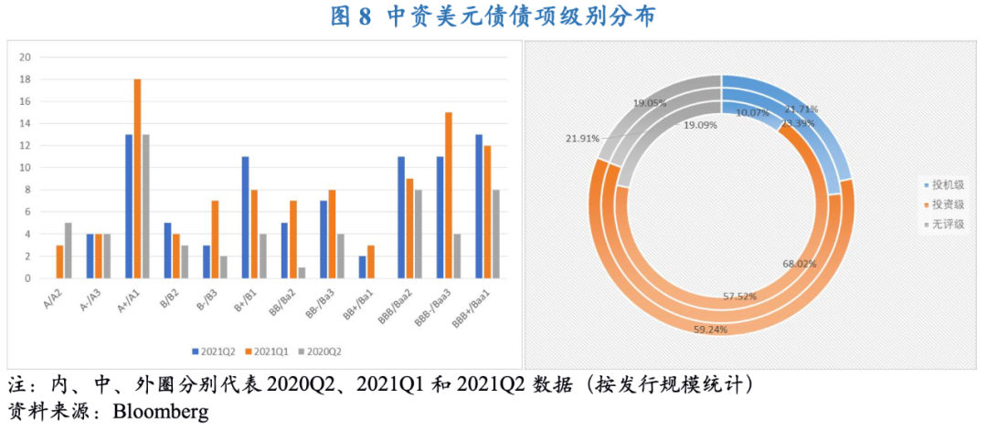 在有評級的中資美元債中,2021年二季度投資級別中資美元債發(fā)行期數(shù)合計52期,占全部發(fā)行期數(shù)的34.0%,環(huán)比和同比分別減少了2.3個和2.5個百分點;投資級債券發(fā)行規(guī)模合計占總發(fā)行規(guī)模的59.2%,環(huán)比增加了1.7個百分比,同比減少了8.8個百分點,說明本季度投資級發(fā)行債券期數(shù)和規(guī)模較上季度明顯回落。此外,投機級別中資美元債發(fā)行期數(shù)和規(guī)模也較上季度明顯下降,BBB-級以下高收益?zhèn)l(fā)行期數(shù)合計33期,發(fā)行規(guī)模占總發(fā)行規(guī)模的21.7%,環(huán)比減少了1.7個百分點,同比增加了11.6個百分點。
