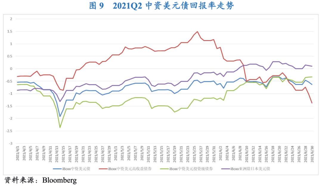 2021年二季度信用風(fēng)險事件繼續(xù)發(fā)酵,拖累中資美元債收益表現(xiàn)。二季度,Markit iBoxx中資美元債指數(shù)總回報率繼續(xù)保持在負值區(qū)間,為-0.1%,環(huán)比收窄0.6個百分點,主要是因為5-6月投資級中資美元債再美國市場流動性寬裕環(huán)境下呈現(xiàn)反彈,投資者風(fēng)險情緒得到小幅緩解。其中,恒大以及藍光等負面消息再次打擊市場情緒,對高收益地產(chǎn)板塊產(chǎn)生溢出效應(yīng),加之融資監(jiān)管持續(xù)收緊,高收益中資美元債二季度回報率繼續(xù)下跌至-1.1%,環(huán)比和同比分別降低了0.4個和10.4個百分點;投資級中資美元債本季度回報率由負轉(zhuǎn)正,為0.3%,主要是因為非金融機構(gòu)表現(xiàn)相對穩(wěn)定,對投資級收益率起到提振作用。
