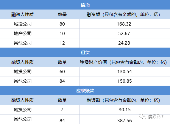 根據(jù)DM的統(tǒng)計信息,2021年4月18日-5月14日,發(fā)行過債券的城投公司在約一個月內(nèi),共實現(xiàn)了147筆非標融資,合計金額為329.01億元,超過300億元!其中:城投公司實現(xiàn)了80筆信托融資,合計金額為168.32億元;實現(xiàn)了60筆融資租賃融資,合計金額為130.54億元;實現(xiàn)了應收賬款融資7筆,合計金額為30.15億元。