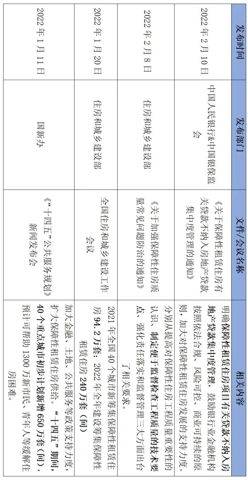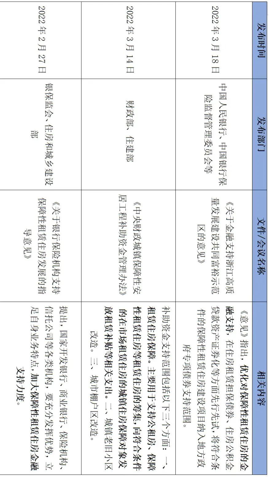2022年第一季度,中央及各地方政府相繼發(fā)布發(fā)展保障性租賃住房的實(shí)施意見,明確保租房供應(yīng)目標(biāo),加強(qiáng)金融支持,完善金融服務(wù)體系,強(qiáng)調(diào)工程質(zhì)量重要性,加速推進(jìn)保障性租賃住房的建設(shè)。
