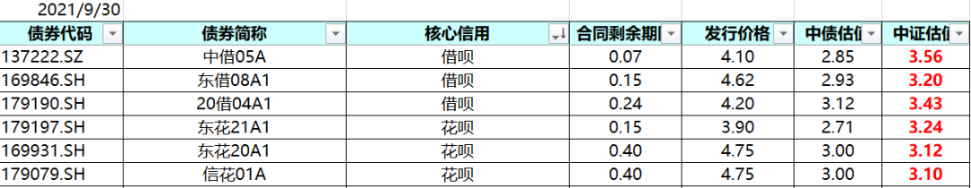 如果說租賃債權、應收賬款等產品底層資產仍然具有一定異質性的話,在房企供應鏈、同一主體發行的同質化消費金融資產等產品中,收益率仍有較大偏差。這種偏差可能是由于交易所ABS/定向ABN是私募發行,估值機構較難獲得產品底層信息造成的。但相應問題較普遍存在于持續發行人連續發行的品種中,造成公允價值的管理混亂。例如下面舉例的存量表內花唄/借唄ABS,雖然中債估值和市場真實收益情況仍有差異,但至少曲線形態相對準確,中證估值則存在曲線形態上的明顯問題。