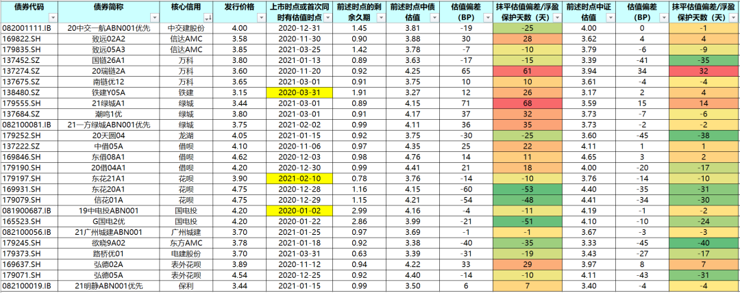 粗略認為一級市場博弈后的發行價格即為當時的真實市場價格,估值和真實市場價格之間的偏差再乘以前述基準日的剩余久期就是價格上的估值偏差。價格上的估值偏差除以票息則是抹平估值偏差(負偏離)的天數或浮盈(正偏離)對應的保護天數。