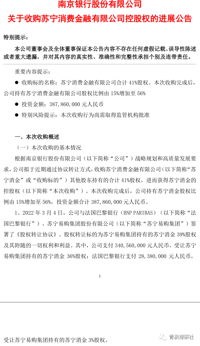 (一)2022年3月7日晚,南京銀行發布公告稱,其以3.8786億元的對價拿下蘇寧消費金融41%的股權,本次收購后,南京銀行持有蘇寧消費金融的股權比例由15%增加至56%,成為蘇寧消費金融公司最大股東,拿下后者的控股權。