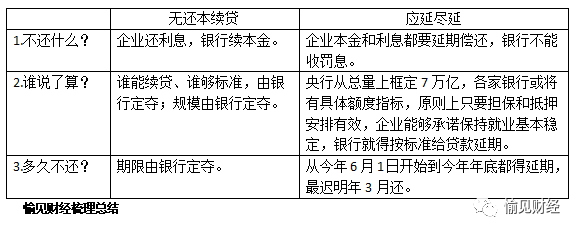 從下表可以看出,“應延盡延”相比“無還本續貸”,企業的實惠更多,銀行的可調節空間(比如試做幾單裝裝門面)更小。