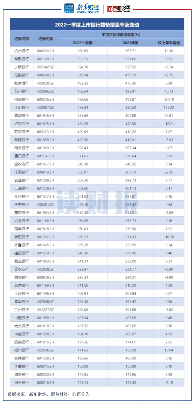 數據顯示,上市銀行的撥備覆蓋率普遍提升,且處于高位。截至2022年一季末,共有31家上市銀行撥備覆蓋率超200%。目前撥備覆蓋率靠前的上市銀行多為中小銀行,其中,杭州銀行撥備覆蓋率位居首位,高達580.09%。其次為常熟銀行,截至一季末,該行的撥備覆蓋率為532.73%。