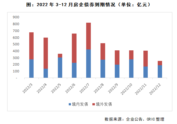 根據監測數據,2022年100家典型房企的到期債券金額超過6000億元,雖較2021年降低了約20%,但在監管去杠桿的趨勢下,壓力仍然相對較大。2022年房企的到期債券主要集中在上半年,3、4、6月份的到期量均超過600億元,超2022年月均到期水平。