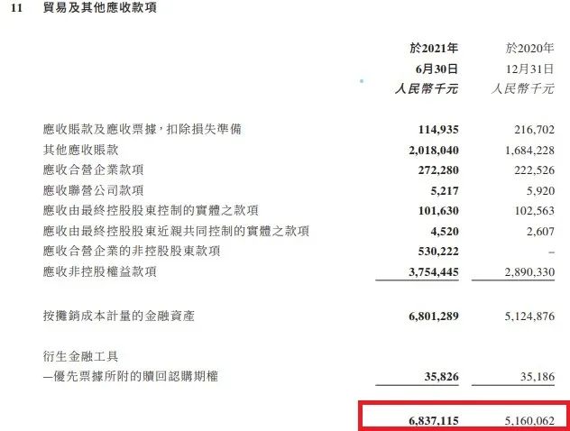 應收款項及票據,2021上半年為68.37億元,2020年同期為51.60億元。