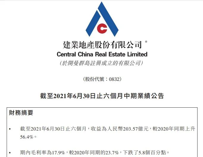 同樣,2021上半年,建業地產的凈利率也只剩下5個點了,2020年同期是6個點。