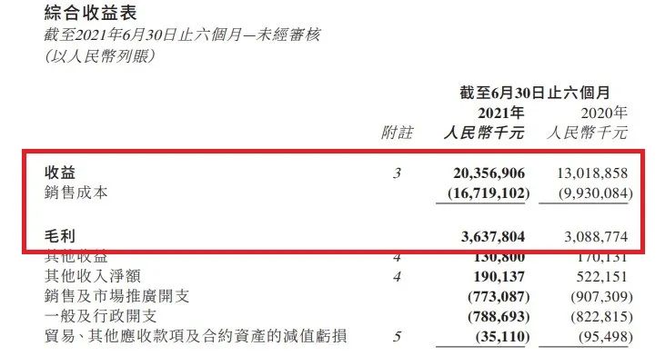 可是我們看毛利,從2020年同期的30.89億元,僅增長至36.38億元。