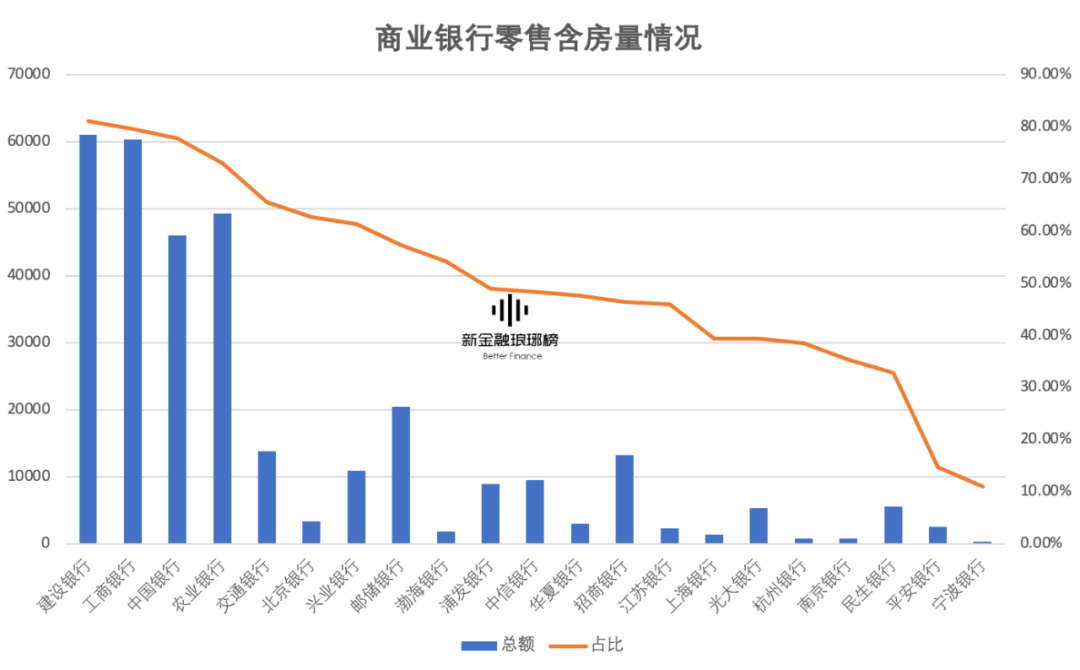 整體上,我國主要商業銀行的零售含房量為30%-80%,中位數在50%左右;越是大銀行越高,達到60%-80%。
