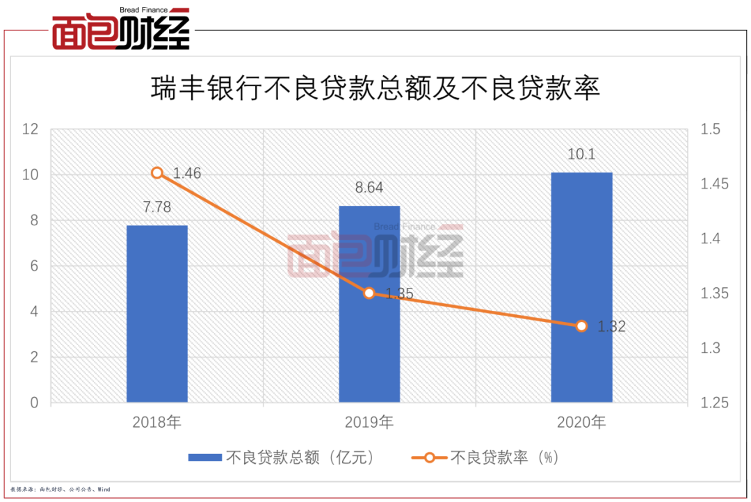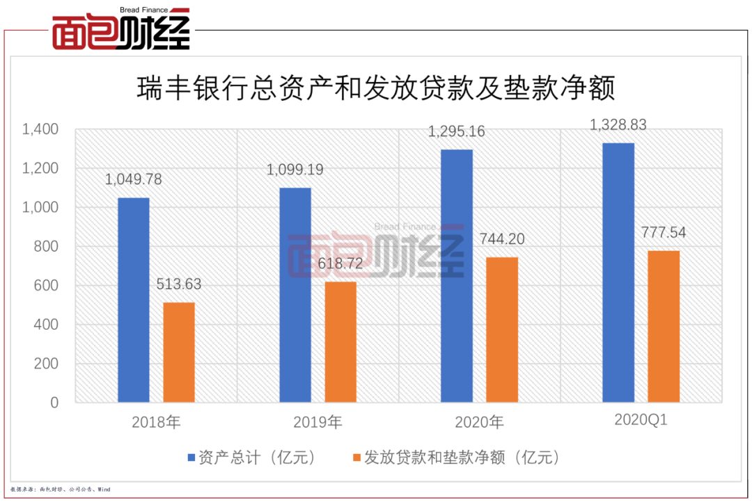 截至2020年末,瑞豐銀行的總資產(chǎn)為1295.16億元,較上年末增長17.83%。2021年一季末,該行的總資產(chǎn)已達(dá)1328.83億元。資產(chǎn)規(guī)模的不斷擴(kuò)大,與該行增加信貸投放有直接關(guān)系。