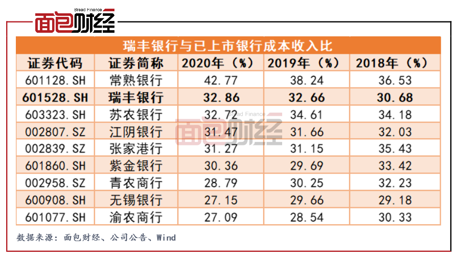 但值得注意的是,瑞豐銀行的成本收入比一直處于較高水平。截至2020年末,該行的成本收入比為32.86%,較上年末相比上升0.2個百分點(diǎn)。與已上市農(nóng)商行相比,僅次于常熟銀行,排在第二位。