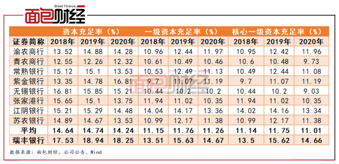 截至2020年末,瑞豐銀行的資本充足率為18.25%;一級資本充足率為14.67%;核心一級資本充足率為14.67%。與其他已上市農(nóng)商行相比,瑞豐銀行的資本充足率水平不僅處于較高水平,且高于可比上市銀行平均值。