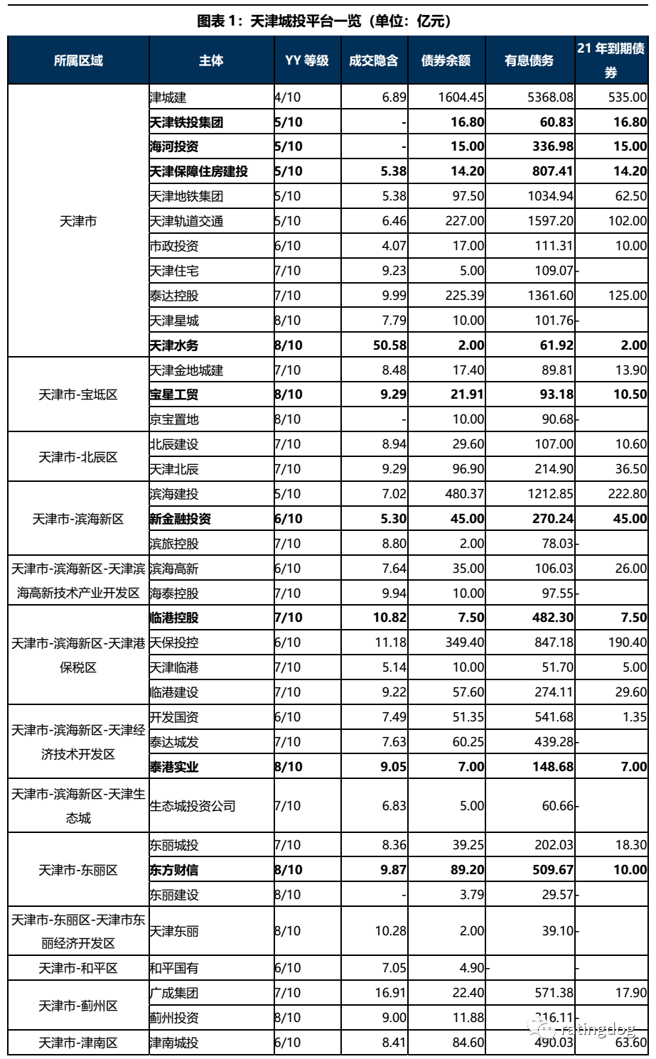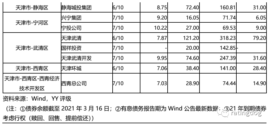 從21年到期/行權債券占存續債余額比例來看,有19個平臺21年到期債券占比超50%,其中7個平臺存續債券均在21年到期/行權,整體來看天津區域城投平臺21年債券到期壓力較大。