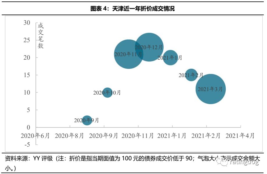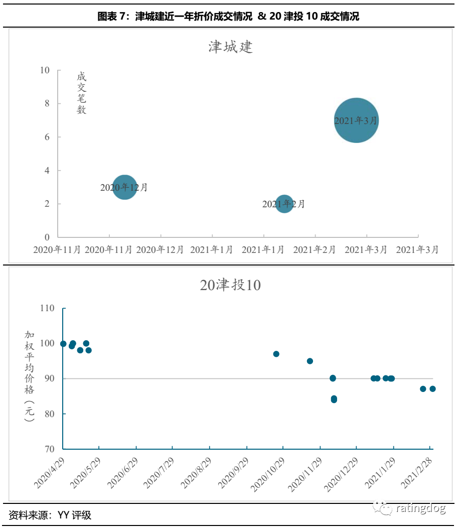 從成交情況來看,津城建折價成交始于20年12月,至21年3月,折價成交開始增多,或受區域負面輿情影響所致。20津投10成交價20年4月以來維持在90以上,20年12月出現零星折價成交,21年2月底價格走低重現折價成交。