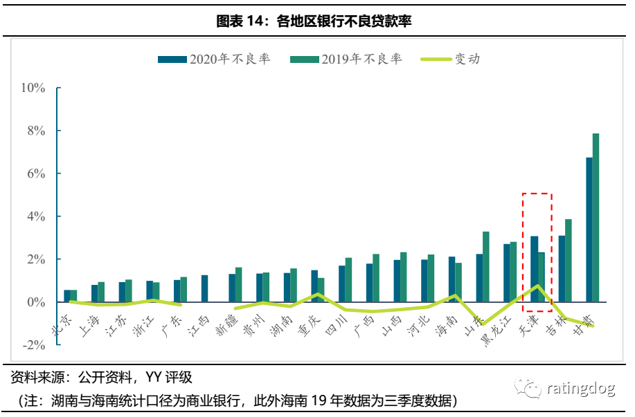 從20省份(市/自治區)的銀行不良貸款率來看,只有天津、重慶、浙江、海南四地20年不良率上升。此外天津銀行不良貸款率排名第三,截至2020年四季度末,天津銀行業金融機構不良貸款率為3.04%,而2019年末為2.29%,上升了0.75%。