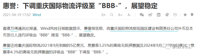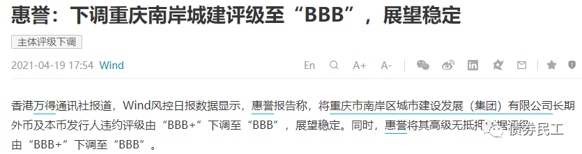 2021年4月29日,境外評級機(jī)構(gòu)惠譽(yù)同時(shí)下調(diào)了重慶國際物流樞紐園區(qū)建設(shè)有限責(zé)任公司和重慶市南岸區(qū)城市建設(shè)發(fā)展(集團(tuán))有限公司的評級級別,由BBB下調(diào)至BBB-。
