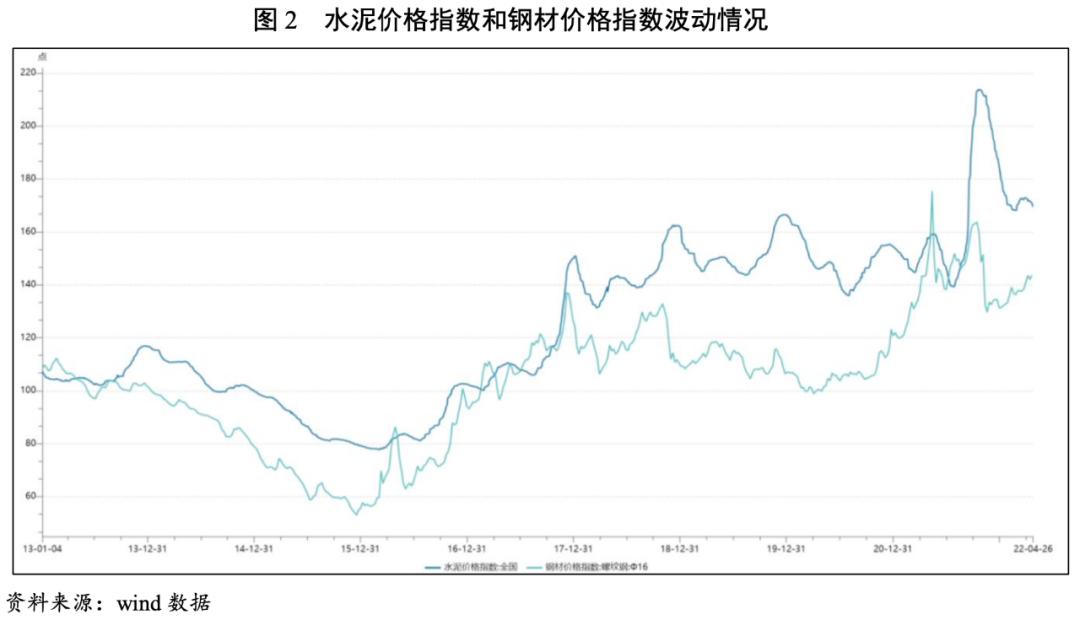建筑施工企業收入季度性波動明顯,2022年一季度收入及利潤環比普遍負增長,主要受冬季停工影響。2022年第一季度,建筑樣本企業收入環比下降19.56%,同比增長8.29%;利潤總額環比下降23.18%,同比增長8.97%;營業利潤率中位數為8.55%,同比下降0.99個百分點,環比下降3.05個百分點。總體來看,受季節性影響,2022年一季度建筑施工企業各項盈利指標環比均呈負增長,收入和利潤同比增速有所提升。2021年以來,隨著經濟及建筑業復蘇帶動需求的穩步提升,水泥和鋼鐵價格快速回暖,利潤率水平受主要原材料價格上漲影響持續承壓,利潤率水平有所下降。