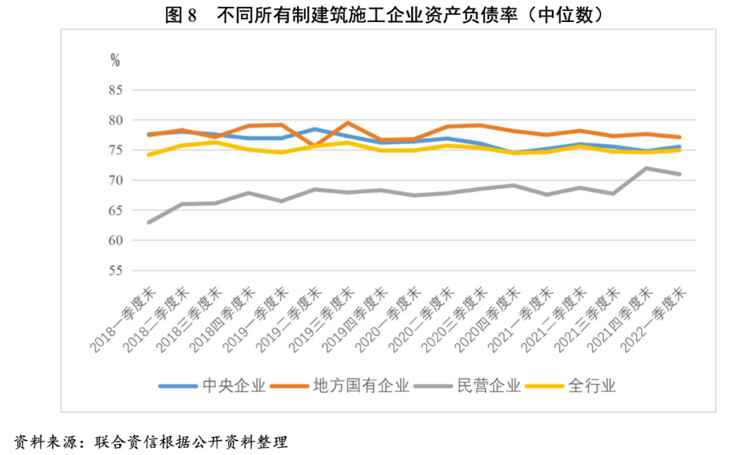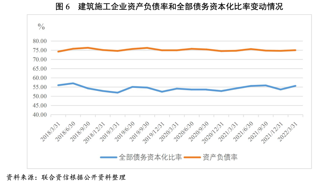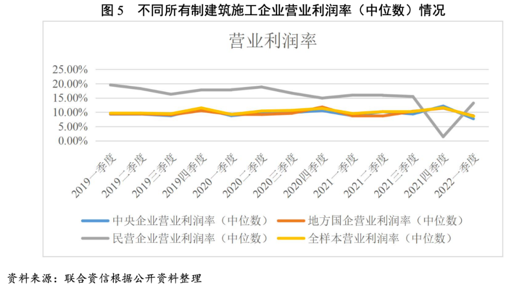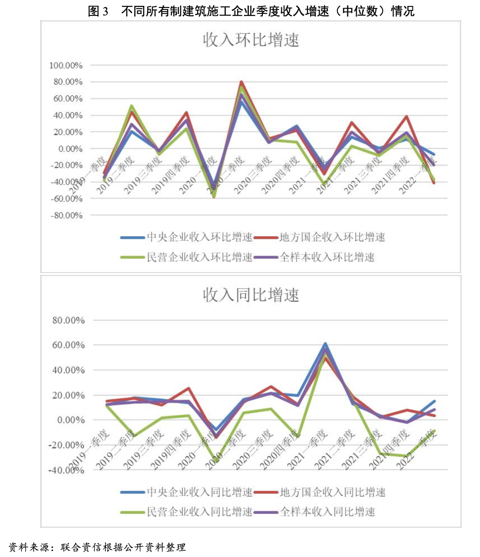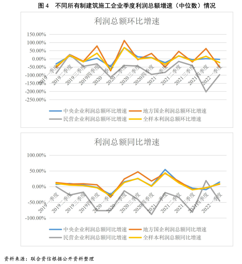 從樣本企業來看,2022年一季度,建筑施工企業營業收入和利潤總額環比增速呈負增長,延續下行趨勢,受主要原材料價格上漲影響利潤率水平有所下降。其中,中央企業和地方國有企業在收入和利潤總額增速方面明顯高于民營企業,行業集中度進一步提高;償債壓力方面,建筑施工企業流動性壓力進一步顯現,短期流動性趨緊,且行業分化明顯,聯合資信將對償債指標明顯弱化及資金鏈壓力較為突出的企業保持關注。