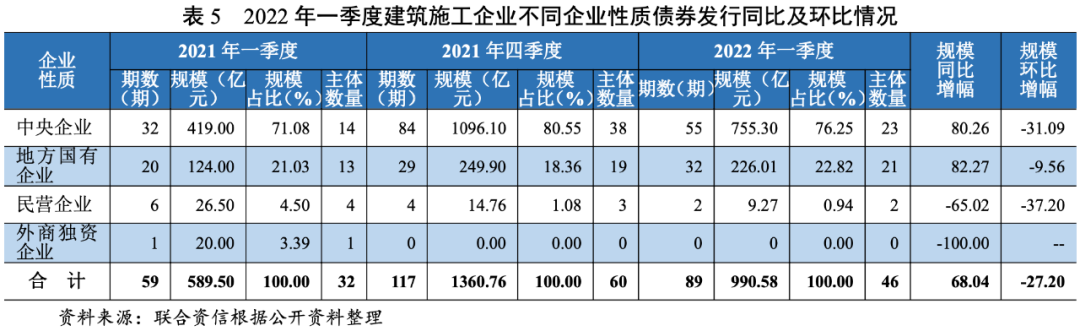 中央企業在發行規模上明顯領先其他所有制企業。從企業性質看,2022年一季度,建筑施工企業中新發債主體46家,同比增長43.75%,環比下降23.33%;其中,中央企業23家,占50.00%,同比增加6.25個百分點,環比下降13.33個百分點。同期,中央企業共發行債券55期,同比增長71.88%,環比下降34.52%;發行規模755.30億元,同比增長80.26%,環比下降31.09%。2022年一季度,中央企業發行規模占總規模的76.25%,同比增加5.17個百分點,環比下降4.30個百分點。
