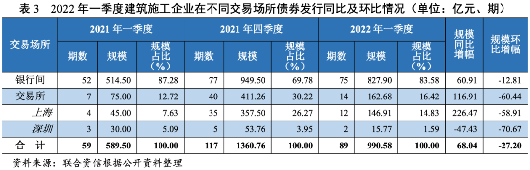 2022年一季度,建筑施工企業發債數量及發行金額同比有所增長,但環比有所下降;從交易場所看,銀行間市場債券發行期數和規模繼續領先于交易所市場;從發行主體級別看,發行主體向高等級集中趨勢未發生變化;從企業性質看,中央企業在發行規模上明顯領先其他所有制企業。