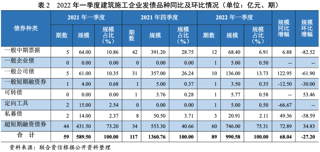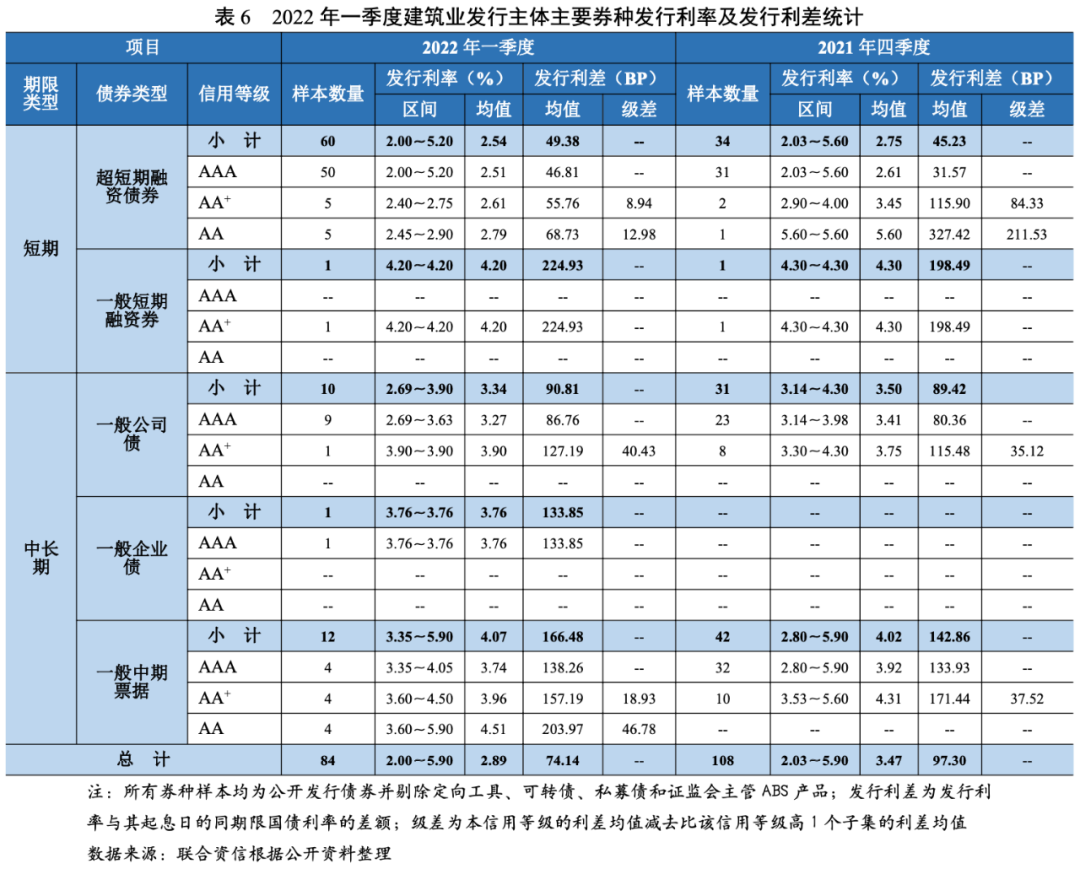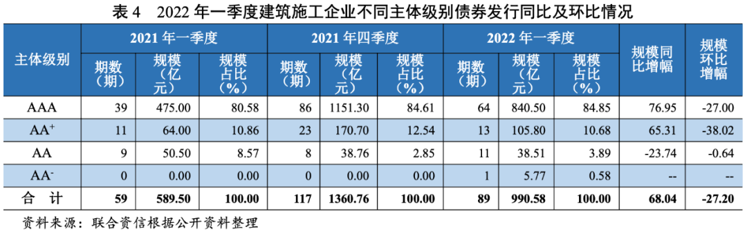 ?2022年一季度,建筑施工企業發債數量及發行金額同比有所增長,但環比有所下降,高信用等級主體融資優勢明顯;從發行主體級別看發行主體向高等級集中趨勢未發生根本性變化。