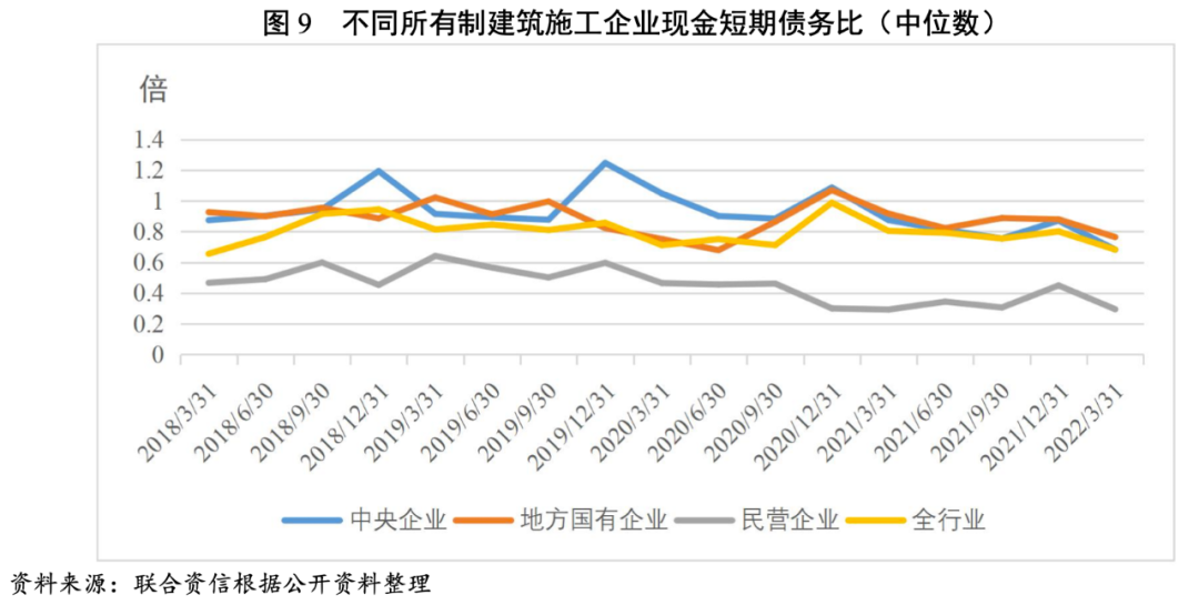 短期償債能力方面,截至2022年3月底,建筑施工企業貨幣資金/短期債務中位數為0.68倍,較2021年3月底和2021年底分別下降15.13%和4.79%,行業短期流動性壓力進一步凸顯。