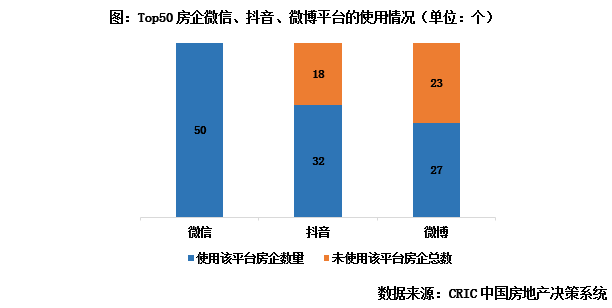 目前房企的新媒體矩陣已經覆蓋包括微信、抖音、知乎等眾多平臺,僅從微信公眾號、微博和抖音三個平臺的使用情況看,根據CRIC統計,截止日前超五成TOP50房企同時使用三個平臺,但僅部分房企保持較高的活躍度,房企媒體矩陣仍有較大發展空間。