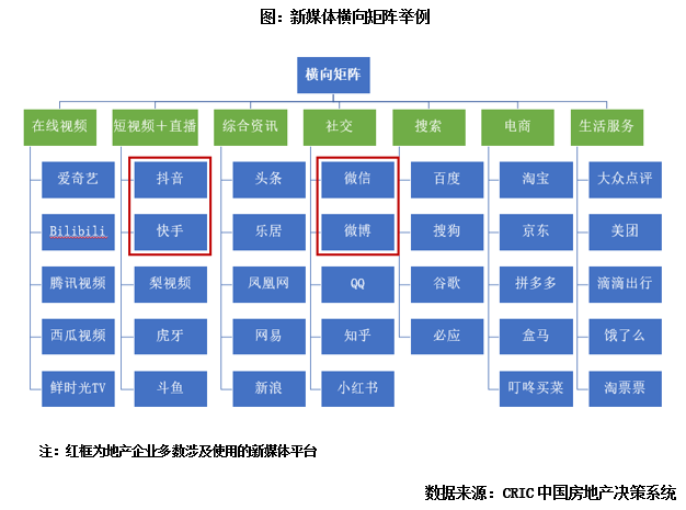 為達到品牌宣傳和口碑提升效果,房企通常會同時在多個平臺上營銷,這時房企的媒體矩陣就形成了。最開始房企多使用報紙、雜志、廣告牌等傳統媒體進行宣傳,伴隨數字科技的突飛猛進,可供房企選擇的宣傳平臺種類更為豐富,也就出現了新媒體矩陣。