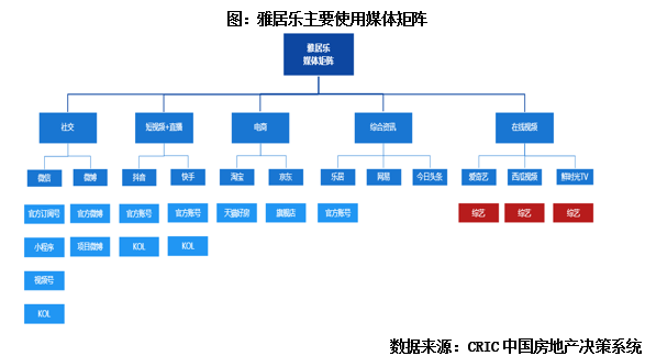 從CRIC監測情況來看,目前雅居樂的媒體矩陣中,橫向矩陣基本覆蓋了各年齡段經常使用的平臺,在社交、短視頻、直播、綜合資訊等平臺均有布局,由于雅居樂跨界綜藝的創新營銷方式,因此媒體矩陣中還包括鮮有房企進駐的在線視頻平臺,這也是雅居樂媒體矩陣的特色之一;縱向矩陣中微信布局較為全面,處于行業內中等偏上水平。