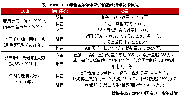 2020年初,雅居樂計劃舉辦第八屆國際沙灘啤酒狂歡節,原希望以“國潮+英倫+啤酒”的形式讓業主感受不一樣的新年氛圍,后期由于疫情未能舉辦,但雅居樂的造勢積極性并未受到打擊。同年11月,超6萬名樂迷齊聚清水灣,雅居樂清水灣·2020海南草莓音樂節開啟全網超2億次的平臺傳播浪潮。2021年雅居樂乘勝追擊,通過雅居樂廠牌天團紅人秀選出“清水灣隊”,進入“樂居廠牌之夜終極大秀”,海南清水灣品牌獲得持續推廣。廠牌天團紅人秀是“地產圈+娛樂圈+直播圈”的勇敢嘗試。2021年12月,雅居樂聯合英皇娛樂制作房產行業內首個綜藝跨界的節目——《因為是朋友呀》,通過與眾多平臺深度內容合作,持續推廣清水灣項目,同時開通抖音小店和“沉浸式”直播,推出明星同款海島游和購房折扣券,實現邊看邊買的線上線下聯動的營銷閉環。