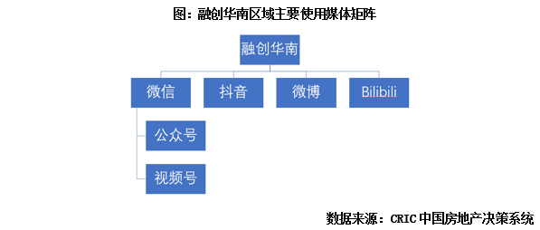 融創華南區域來看,基于數字化營銷數據沉淀,融創華南區域積極構建新媒體矩陣,對抖音、微信等產品進行數據打通,線上營銷形成閉環。首先是搭建媒體矩陣:融創華南區域利用三大新媒體平臺實現四條流量入口,即微信公眾號、微信視頻號、抖音和微博,另外融創華南也開設B站,面向年輕人主打微綜藝。