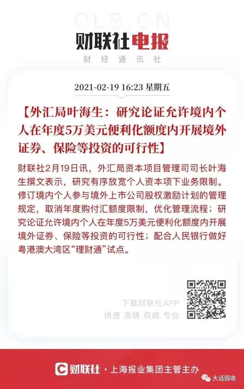 就在一小時(shí)前,又有一個(gè)比較爆炸性的信息。外匯局資本項(xiàng)目管理司司長(zhǎng)葉海生表示,研究論證允許境內(nèi)個(gè)人在年度5萬(wàn)美元額度內(nèi)開展境外證券、保險(xiǎn)等投資的可行性。