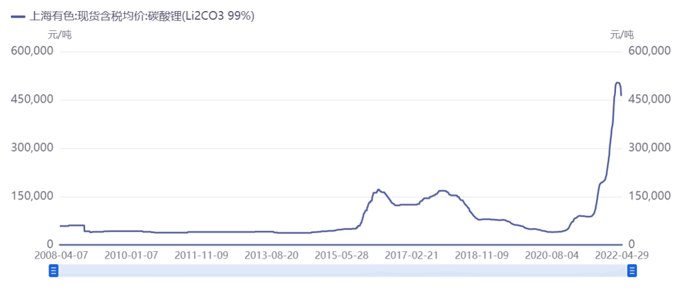 根據(jù)上海有色報(bào)價(jià),碳酸鋰自4月7日創(chuàng)下502,500元/噸的價(jià)格后,連續(xù)回落突破500,000元/噸關(guān)口,4月14日?qǐng)?bào)價(jià)495,000元/噸,4月28日?qǐng)?bào)價(jià)已跌至461,500元/噸。