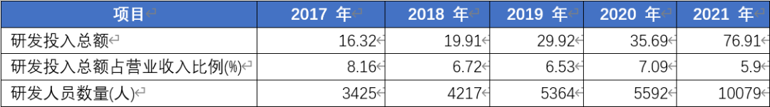 截至2021年12月31日,公司擁有研發(fā)技術(shù)人員10,079名,其中,擁有博士學(xué)歷的 170 名、碩士學(xué)歷的2086名,整體研發(fā)團(tuán)隊(duì)規(guī)模和實(shí)力在行業(yè)內(nèi)處于領(lǐng)先地位。截至 2021年12月31日,公司及子公司共擁有3772項(xiàng)境內(nèi)專利及673項(xiàng)境外專利,正在申請(qǐng)的境內(nèi)和境外專利合計(jì)5777項(xiàng)。