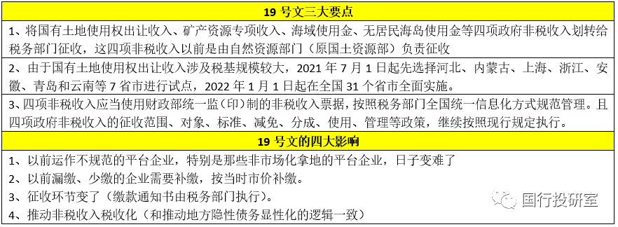 2021年6月4日,財政部、國土資源部、國稅總局和央行聯合發布的19號文便是為了通過將土地出讓收入的征收部門由自然資源部(原國土資源部)劃轉至稅務部門,來規范土地出讓收入的收繳(如拖欠、漏繳、先征后返等),降低地方政府的自由裁量權,以精細化、精確化管理土地出讓收入。