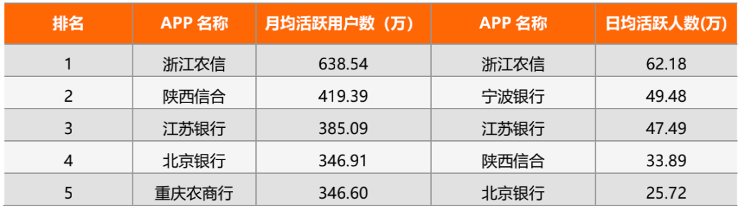此外,江蘇銀行在中小銀行之中,2項指標的排名保持不變,均位列第3名。月均月活躍用戶數和月均日活躍人數的第五名分別是重慶農商行346.60萬、北京銀行25.72萬,遠高于2個維度的平均值,中小銀行頭部App正在加速趕超國有大行與全國性股份制銀行的生態平臺建設進程。