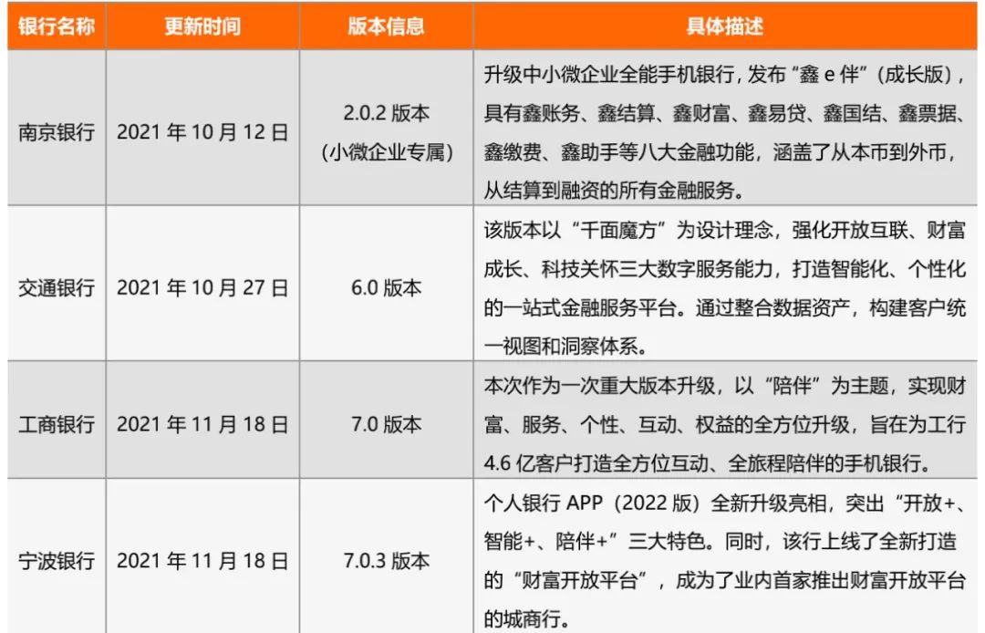 進入2021年下半年以來,我國零售金融業務涌現出全新的發展熱潮,譬如全民理財、智能隨身陪伴、一站式全場景生態平臺等新穎功能。目前,手機銀行App承載著零售金融縱深變革的重任,各家銀行均加快了迭代更新速度。同時,銀行業App“瘦身”也成為業界關注焦點,逐漸將手機銀行打造為獲客主渠道,以此來打造一個具備特色生態基因的數字銀行。