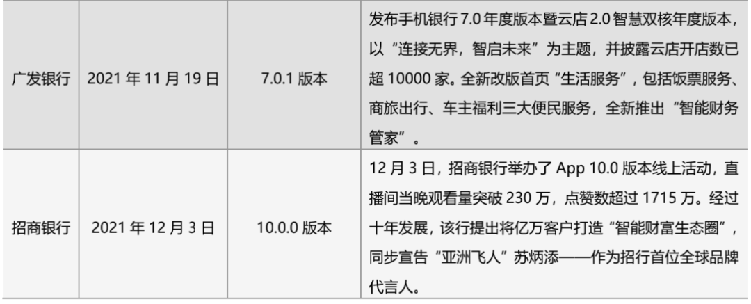 一是招商銀行發布10.0.0版本,作為“零售之王”,12月3日舉辦的線上發布會主題為“10”全“10”美,并突出“招財號”財富開放平臺的核心價值。App歷經10年發展,在業界具備領先優勢。尤其是招商銀行App正式通過“移動互聯網程序(App)安全認證”,成為銀行業首個通過該認證的App,展現在個人信息保護方面的領先性;