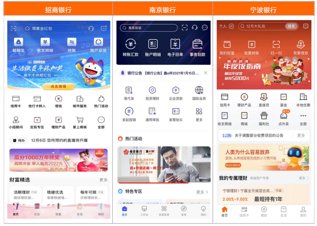 整體來看,商業銀行移動端的平臺建設,主要包括手機銀行App、微信公眾號/小程序、網上銀行以及電話銀行等4類渠道。其中,手機銀行App是獲取線上流量最主要的端口,下面展示了3家典型的手機銀行App首頁布局情況。其中,寧波銀行作為城商行之中的特色標桿,在財富開放平臺、場景布局方面具備獨特性,App評分名次靠前。下文將圍繞寧波銀行的手機銀行建設運營情況,進行全景化展示。