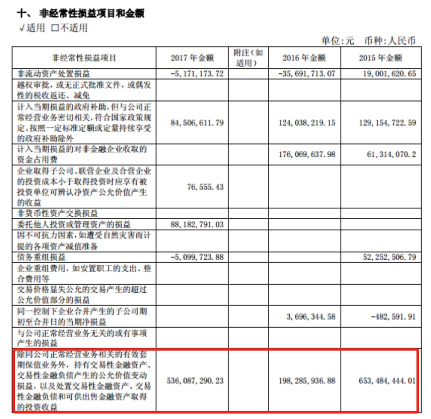 2015-2017年,公司非經常性損益合計約25.63億元,占到同期歸母凈利潤的35.67%(追溯調整后)。
